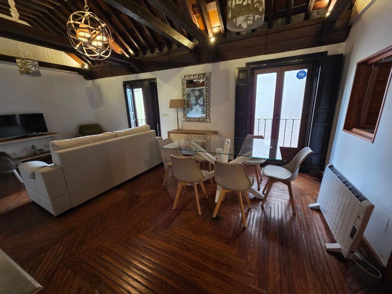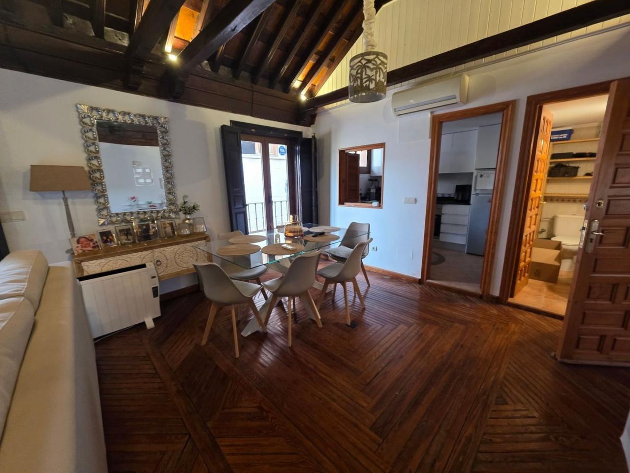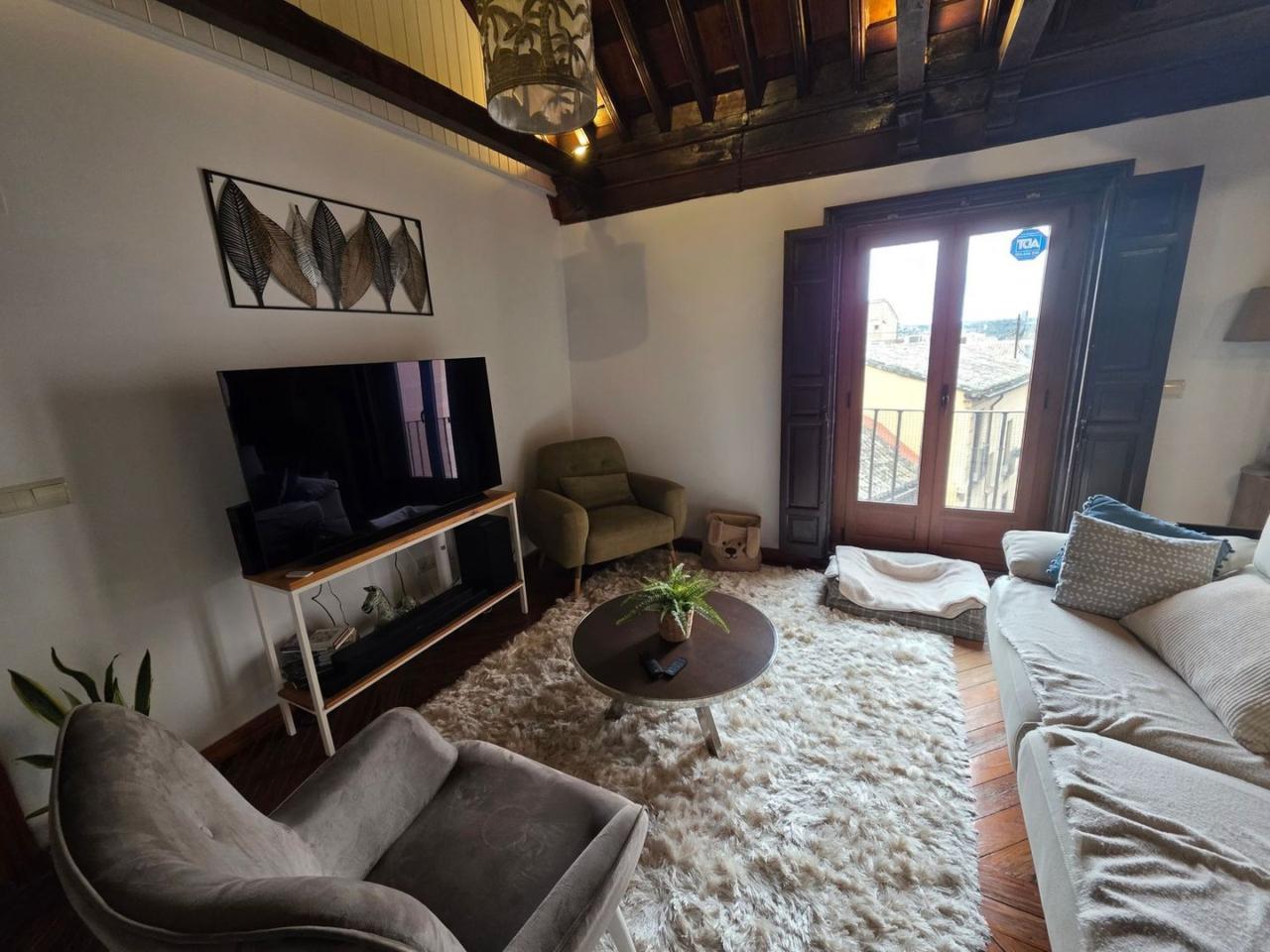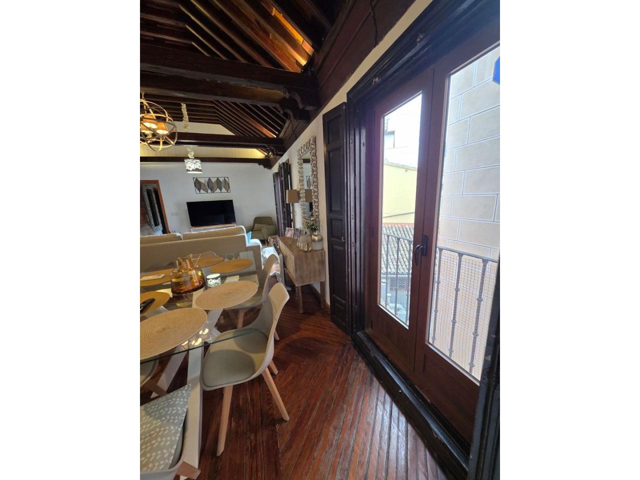 El diseño interior destaca por sus suelos de tarima rústica y vigas de madera vistas en los techos, creando un ambiente acogedor y cálido. Disfruta de las impresionantes vistas de Toledo desde los balcones del ático, donde podrás relajarte y contemplar la belleza de la ciudad.